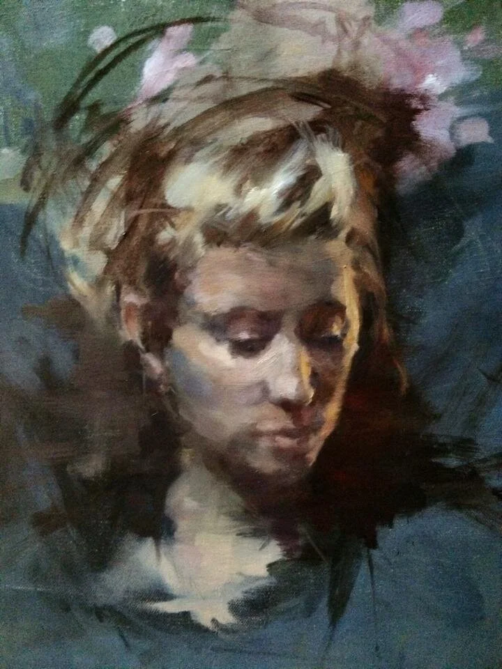 Well, I think her name was Alison, a model from a Max Ginsburg workshop. She was British, I remember that, like me, and I made her a cup of tea in one of the breaks. The pink around her hair is from the shirt of a woman I painted over before, but it seemed to inform and work for this pose too. Lucky!